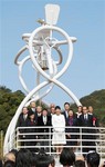 高田屋嘉兵衛公園での式典には夫人の深田雄子さんも参加。「こんな機会めったにおまへんで」と笑う和田さんと一般市民約7千人が「あの鐘を〜」を大合唱。故郷に大きな歌声が響いた。